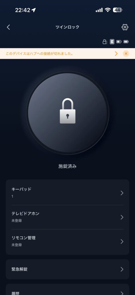 セットアップは簡単に終わったものの、どうしてもハブミニとスマートロックの接続が安定せず、「このデバイスはハブへの接続が切れました」のメッセージが出続ける状態に陥りました。